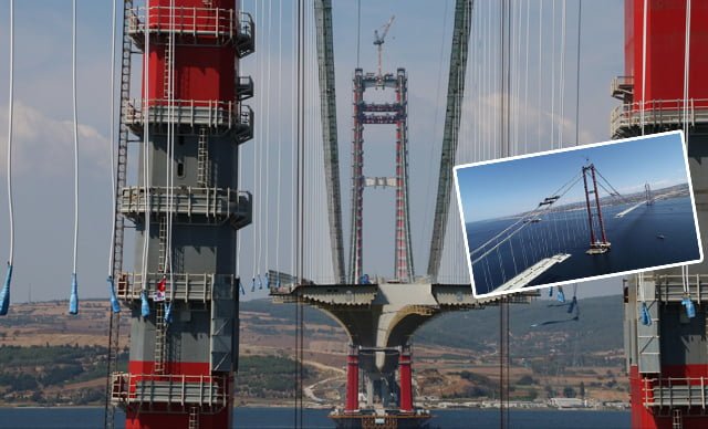 Temeli, 18 Mart 2017’de Cumhurbaşkanı Recep Tayyip Erdoğan tarafından atılan 1915 Çanakkale Köprüsü, 2023 metrelik orta açıklığıyla Cumhuriyet’in 100’üncü kuruluş yılını simgelediği gibi ‘dünyanın en uzun orta açıklığa sahip asma köprüsü unvanı’na da sahip olacak. Çanakkale Deniz Zaferi’nin kazanıldığı tarih olan 18 Mart’ı simgeleyen 318 metre yüksekliğindeki kulelere sahip 1915 Çanakkale Köprüsü’nün açılışı da Zafer’in 107’nci yıl dönümünün kutlanacağı 18 Mart 2022’de yapılacak. 5 bine yakın çalışan ile 24 saat aralıksız devam eden çalışmalar sonucu Çanakkale Köprüsü’nün büyük bölümü 4,5 yılda tamamlandı. Köprünün açılışına ise 6 ay kaldı.