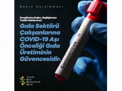 Türk Mühendis ve Mimar Odaları Birliği (TMMOB) Gıda Mühendisleri Odası, “Gıda Sektörü Çalışanlarına Kovid-19 Aşı Önceliği Gıda Üretiminin Güvencesidir. Emeğimize Değer, Sağlığımıza Tedbir Bekliyoruz” başlığıyla bir basın açıklaması yaptı.