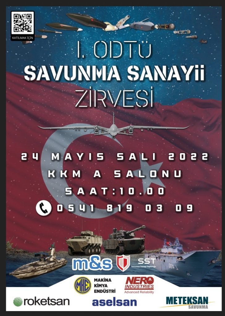 ODTÜ Savunma Sanayii Topluluğu, 24 Mayıs 2022 Salı günü KKM A salonunda I. ODTÜ Savunma Sanayi Zirvesi’nde öncü firmaları buluşturuyor. Etkinliğe ASELSAN, ROKETSAN, MKE, METEKSAN, NERO Endüstri temsilcileri konuşmacı olarak katılacak ve ülkemizin savunma sanayi alanındaki tecrübe, görev ve sorumlulukları üzerine sunumlar gerçekleştirecekler.