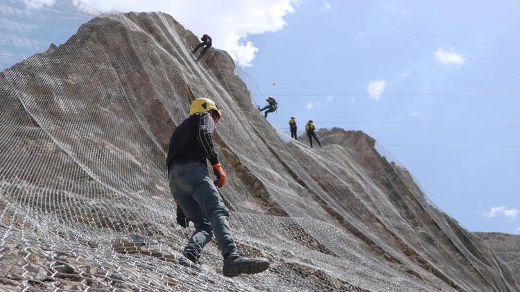 Tortum- Uzundere ilçeleri arasında geçen yıl başladığımız toplam 7 bin metrekare alanı bitirmek üzereyiz. Vinç yardımı ile dağın zirvesine taşıdığımız yaklaşık 3’er metre uzunluğundaki çelik tel balyaları aşağı doğru sarkıtıyoruz. Daha sonra belimize bağladığımız halat yardımı ile onları birbirine monte ederek aşağı iniyoruz. İlmek ilmek ördüğümüz çelik ağ sayesinde dağdan kopan kaya parçalarının yola düşmesini engelliyoruz.
